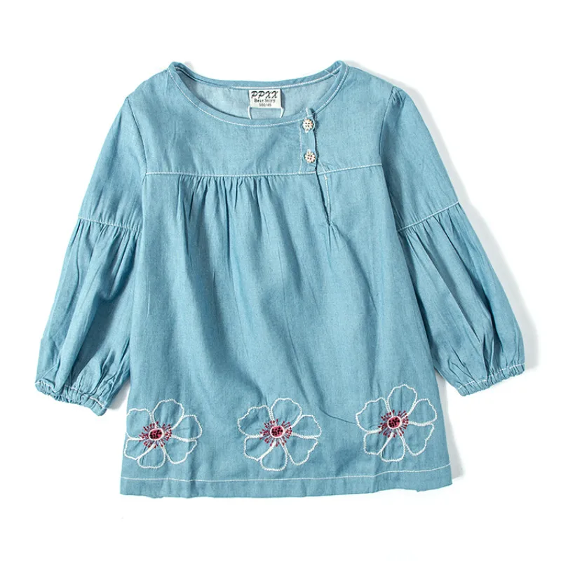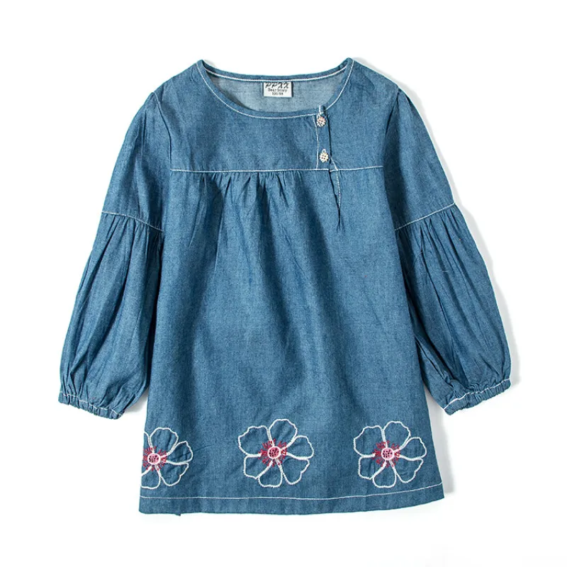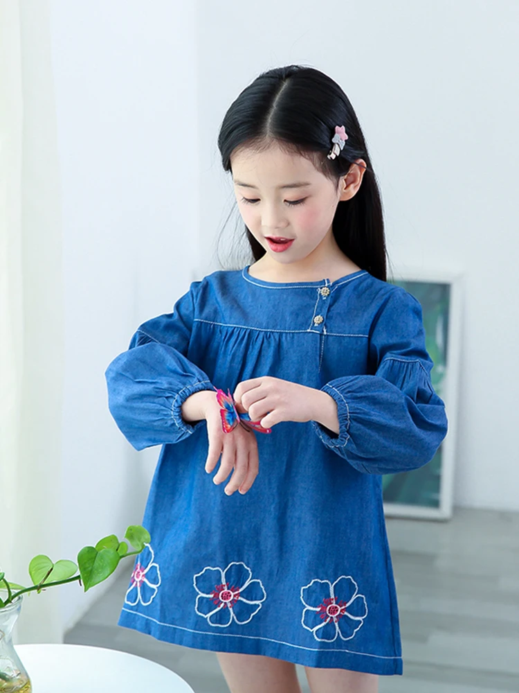 On sale Printemps nouvelles filles robe en denim de coton. 2-7T fleur broderie mignon à manches longues rob